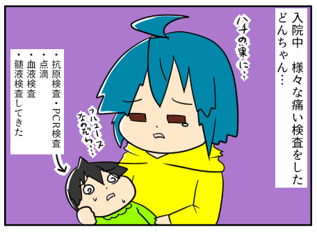 新型コロナもインフルエンザもどういうわけかどんちゃんだけ無事、というのがいつもの我が家だったため、様々な可能性を疑ってこんなに痛い検査のオンパレードはどんちゃんの人生で初めてのことでした。ええそれはそれは夜泣きしました(:3 」∠)しゃーなし